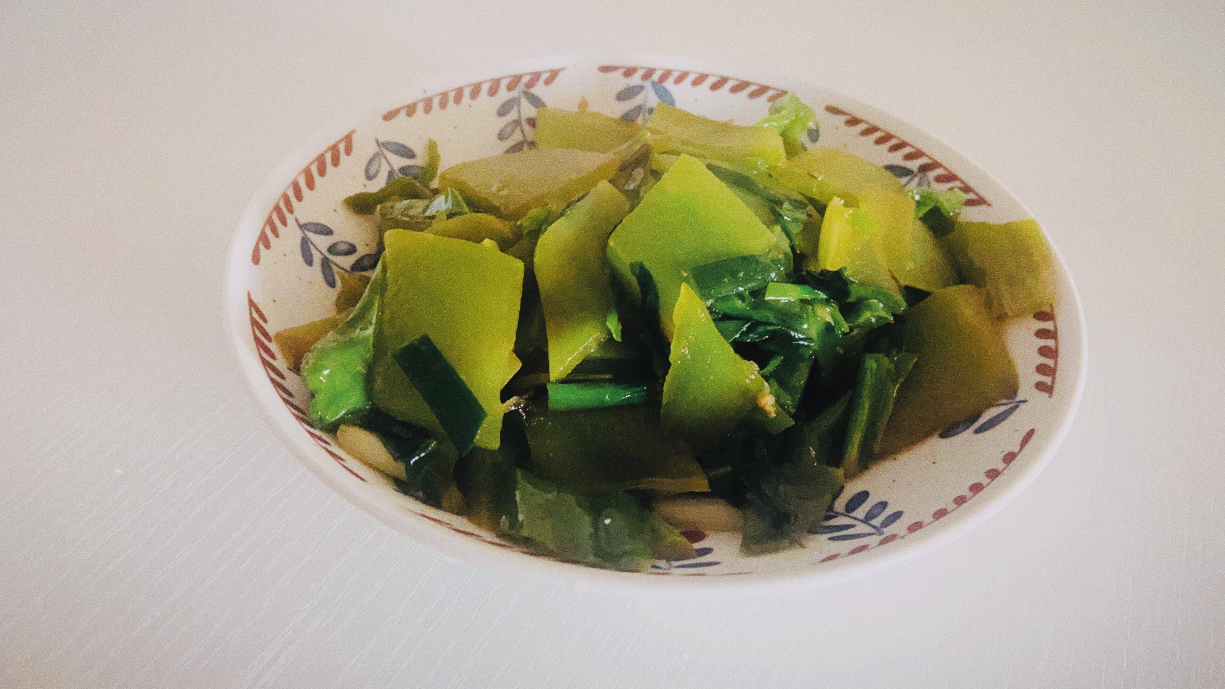 萵筍去皮之後切成片,青椒香蔥也準備點。起油鍋,下萵筍片翻炒至變軟,加一點豬油,倒入青椒炒至斷生,加一點生抽上個色,孩子喜歡吃著色深一些食物,最後加鹽提味,散上香蔥就可以出鍋瞭。