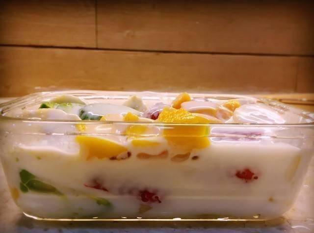 然後我們把之前準備好的酸奶從水果上面倒進去,讓酸奶順著水果自然流進碗裡,均勻的分佈在水果表面和碗裡。然後蓋上保鮮膜冷藏一段時間再食用。如果酸奶和水果事先冷凍起來,就可以立即食用。吃的時候還可以裝飾一些草莓或者檸檬,這樣看起來會更開胃,也更有美感!