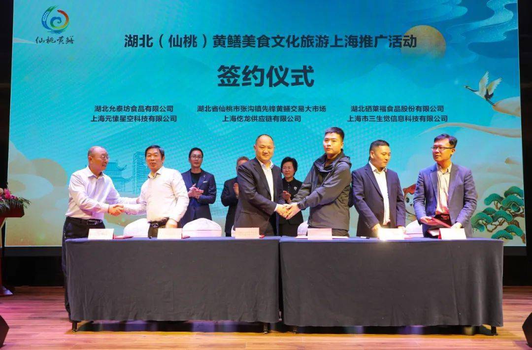 簽約儀式上,上海餐飲企業傢精英會、無錫君來酒店集團分別與我市簽訂瞭戰略合作協議,仙桃聯合武漢面向上海市場投放1000萬元文旅消費券。仙桃張溝先鋒交易大市場、湖北允泰坊食品有限公司、湖北硒萊福食品股份有限公司與上海元愫星空科技有限公司、上海市三生覺信息科技有限公司、上海仡龍供應鏈有限公司簽訂購銷協議,總簽約金額6.2億元。湖北海外旅遊集團與徐霞客中國旅行商商會簽訂向仙桃組織350個華東療休養團、輸客15000人的合作協議。