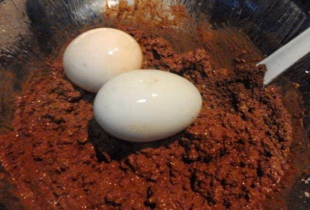 第四步:將它們打成泥。攪拌成糊狀後,將去皮的雞蛋放入碗中,將雞蛋蓋在混合糊中,然後密封在之前準備好的容器中。 ,放置陰涼處10天左右。時間過去後,洗去醃雞蛋上的沉積物,放入水中煮15分鐘。