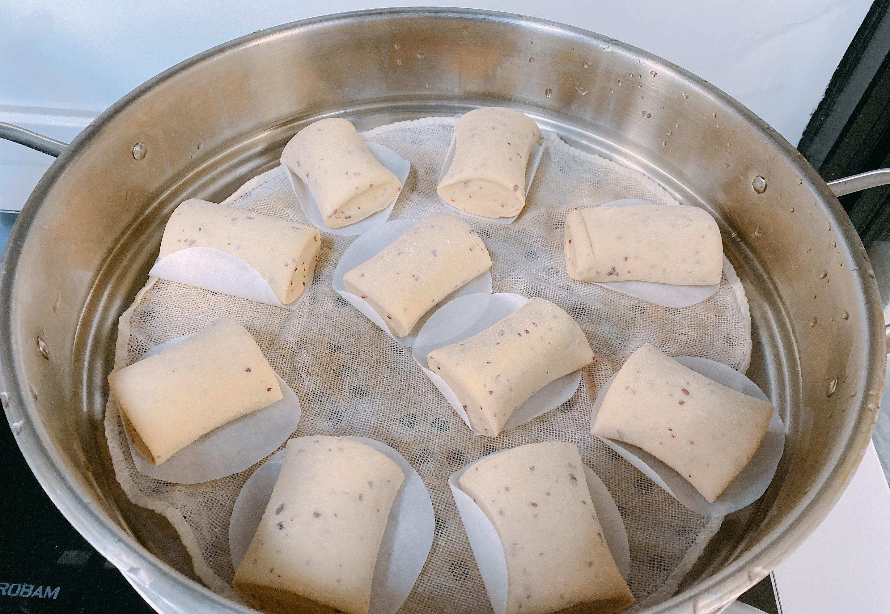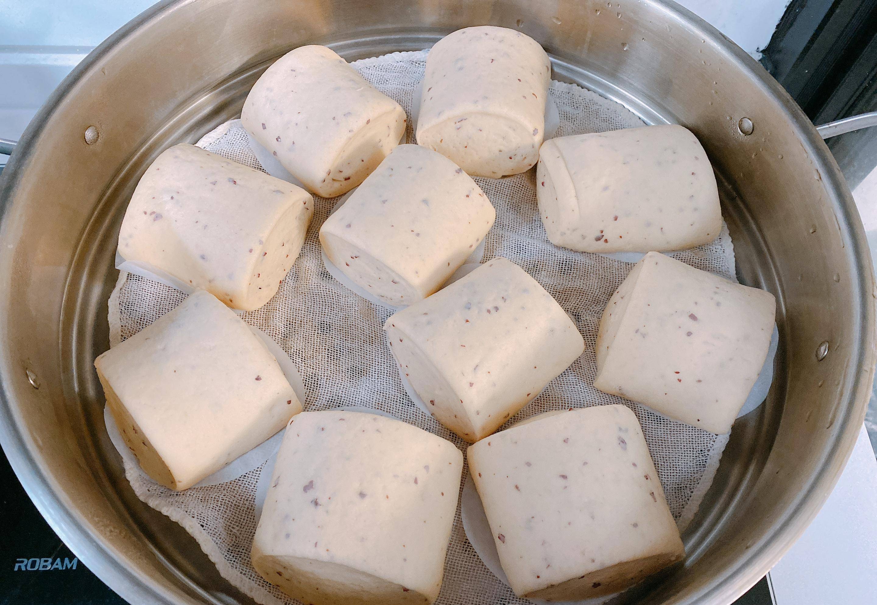 7、冷水上鍋蒸,水開蒸12分鐘左右,關火燜3分鐘左右再出鍋,蓬松暄軟還帶有點嚼勁的山藥紅棗饅頭就做好瞭。
