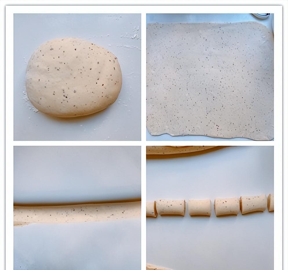 5、揉好之後將面團稍微整理一下,開始用搟面杖搟面團,將面團搟成一個長方形的面皮,搟好之後從一端開始卷,搟成圓柱形,如果感覺面皮較粗,可以再搓細一些,搓成合適粗細的長條之後,再分切成大小均勻的面團,面團可以切成長方形的,這樣蒸好之後不容易倒。