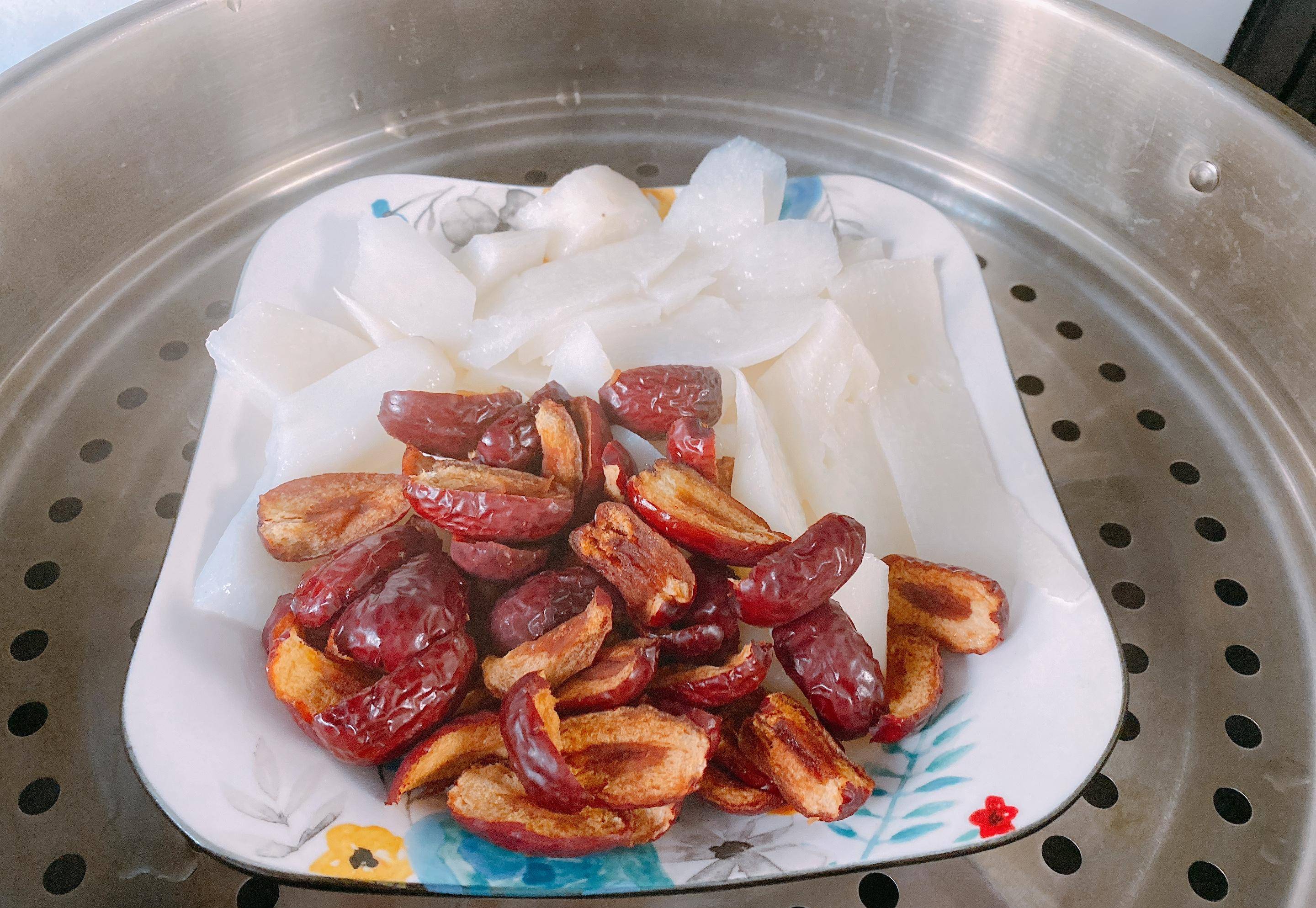 1、準備好的老山藥去皮之後切成片,紅棗清洗幹凈之後去核,山藥的用量大約是250g、紅棗80g,冷水上鍋蒸,水開再蒸15-20分鐘,具體時間可以根據山藥的狀態來決定,用筷子戳一下,山藥能輕松戳透,說明可以出鍋瞭。