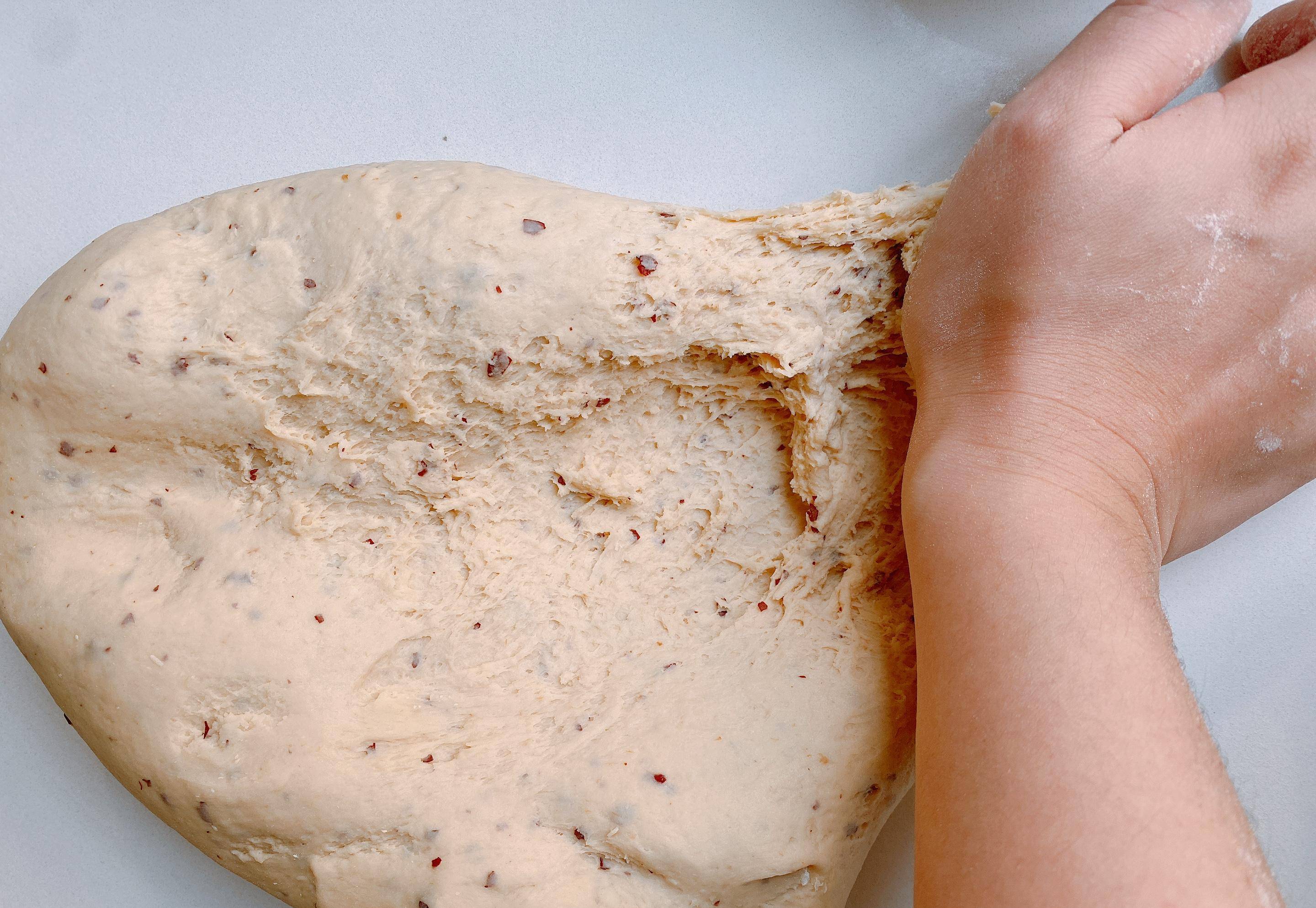 4、揉成團之後,表面是很粗糙的,這時候需要多揉一會,像搓衣服一樣將面團往外搓,大約需要揉面10-15分鐘,因為這裡采取的是一次發酵法,想要面包細膩柔軟,揉面這一步必不可少,可以多揉一會。