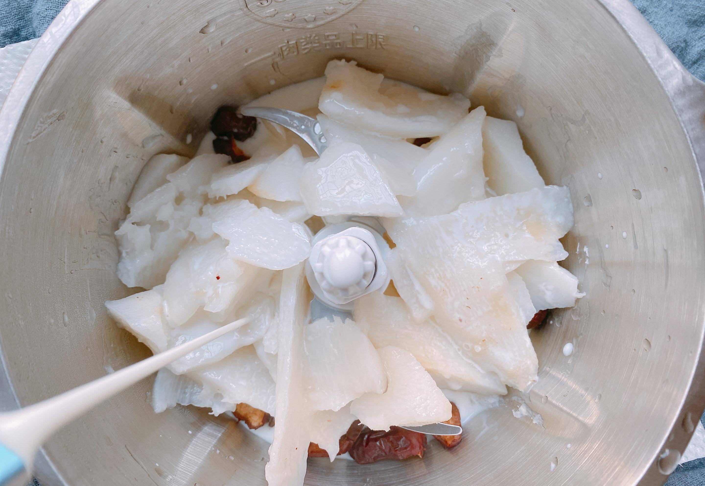 2、蒸好的山藥和紅棗放在放在料理機中,加入一盒牛奶(牛奶是200ml的),將紅棗和山藥攪成細膩的糊狀,晾至溫熱之後再用來和面。