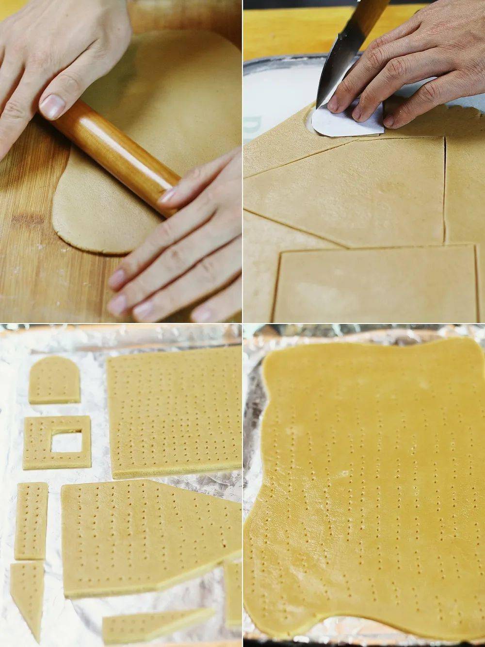 制作薑餅屋之前,我們可以先在紙上畫一個組件圖。將屋子的各部分拆分開,畫在紙上,再剪下來,就可以比照著來切割面團。