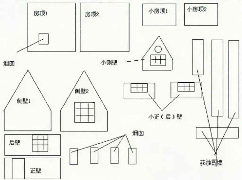 這個圖的比例有點問題(比如煙囪不應該是四個正方形,而應該有兩個是斜邊的,因為屋頂是斜的)。實際制作的時候我沒有做花池圍墻。