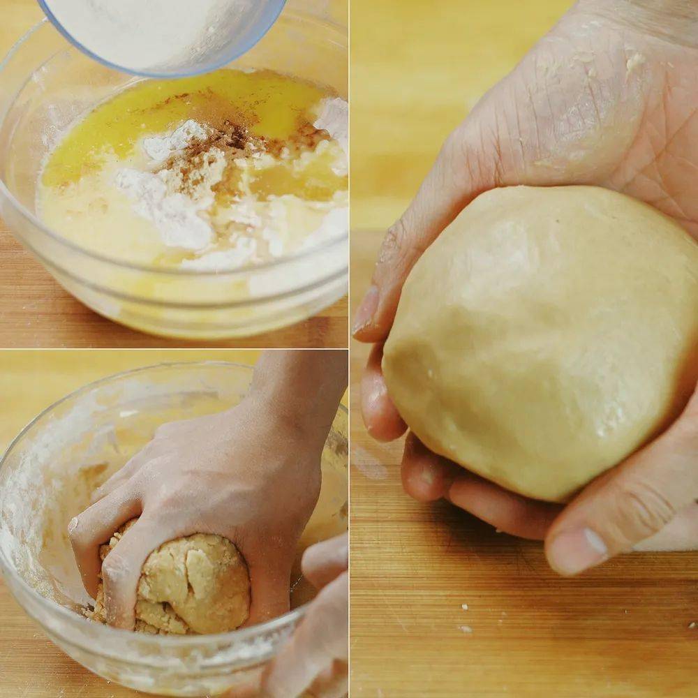 把制作薑餅的所有配料倒入碗裡,用手混合揉勻,成為面團。