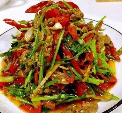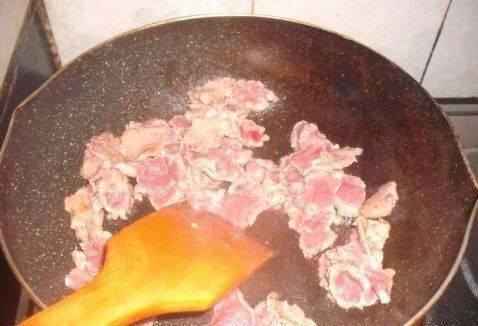 4、然後加入牛肉炒熟,加入香菜翻炒幾下,加少許味精和胡椒粉調味即可食用。