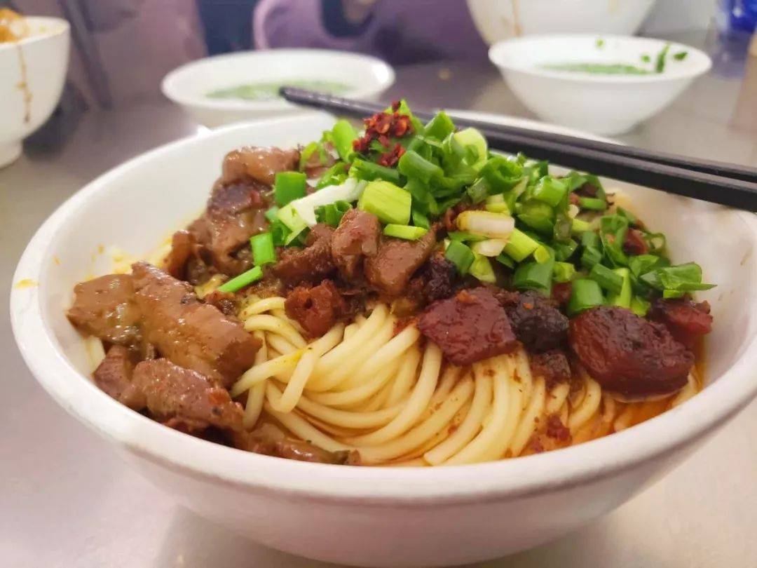 和南華鹵面一樣,丁記鹵面也是開瞭30多年的老字號。店裡有面、有米線、有餌絲,價格實惠公道,30多年來陪伴瞭無數食客。直到今天到瞭飯點,依然需要排隊。店裡的招牌鹵面是肥腸血旺鹵面,這種組合讓人聯想到貴州的腸旺面。招牌菜的意義,就是讓人品嘗到最能代表店內口味的水準。所以新客進店,點一碗鹵面加肥腸和血旺,不會出錯。