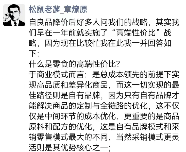 隔壁的三隻松鼠董事長章燎原面對良品鋪子的降價,也罕見在朋友圈發聲:“其實我們早在一年前就實施瞭‘高端性價比’戰略。”言外之意,良品鋪子的戰略,我們早在一年前就佈局瞭。