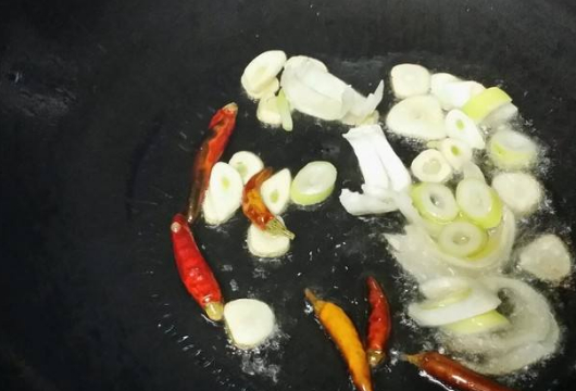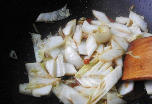 5、鍋中放入適量的食用油燒熱,依次放入準備好的蔥薑蒜和辣椒,爆出香味後放入瀝幹水的白菜,翻炒幾下後再加入生抽、老抽和耗油,可以調色和調味。