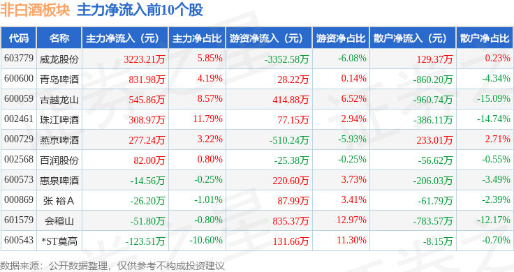 從資金流向上來看,當日非白酒板塊主力資金凈流入1660.6萬元,遊資資金凈流入810.44萬元,散戶資金凈流出2471.04萬元。非白酒板塊個股資金流向見下表: