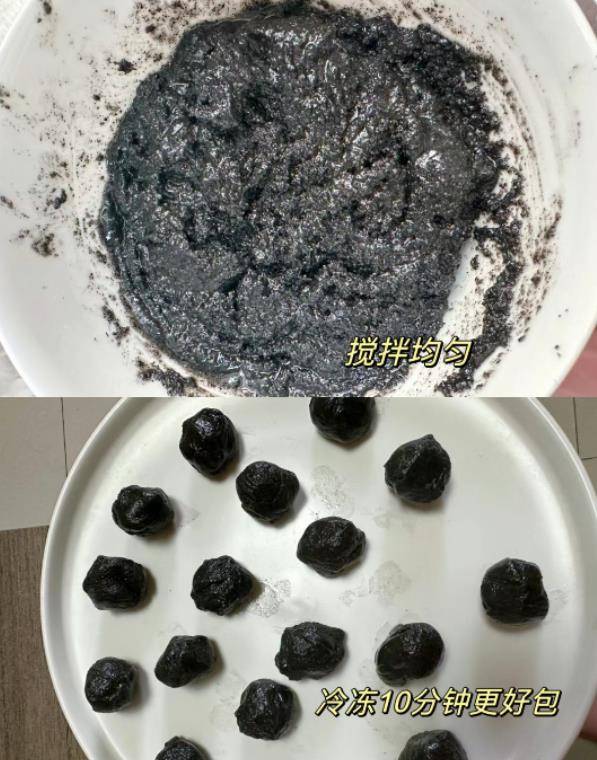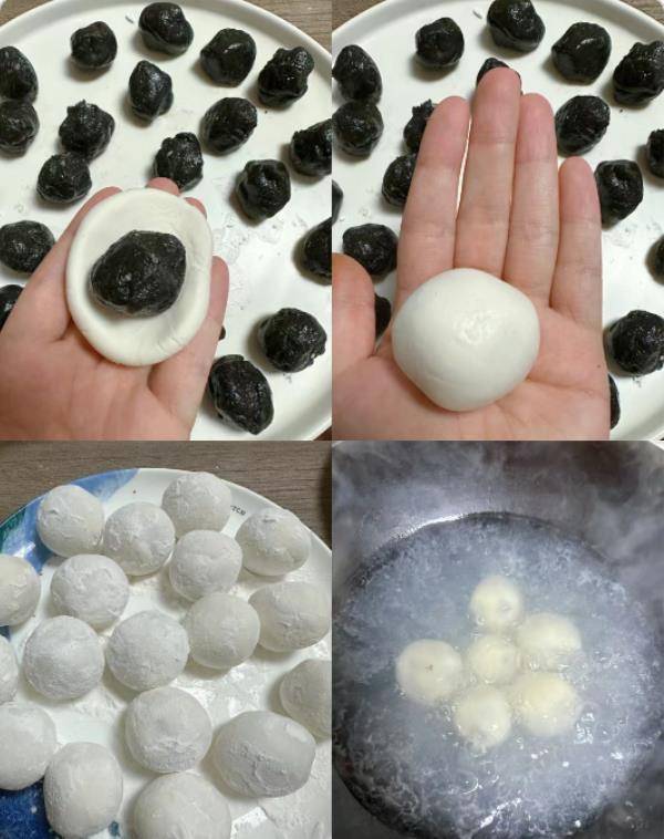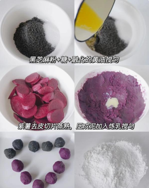 材料:90克黑芝麻,10克去皮花生,40克糖粉,80克豬油,15克蜂蜜,200克水磨糯米粉。