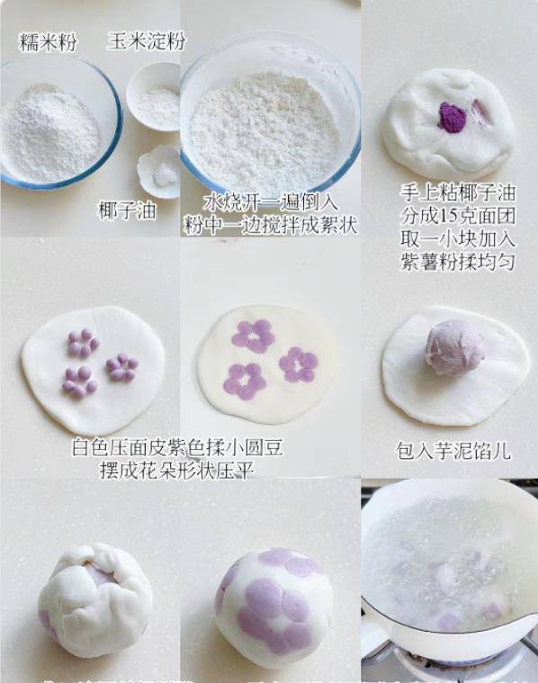 材料:糯米粉100克,玉米淀粉12克,開水72克,紫薯粉少許,椰子油少許。