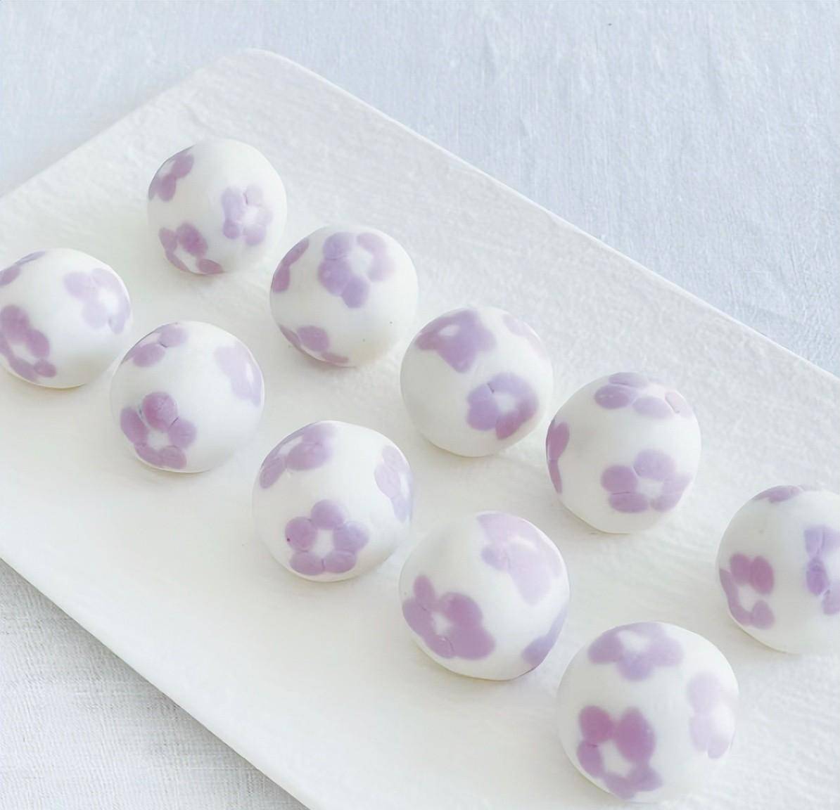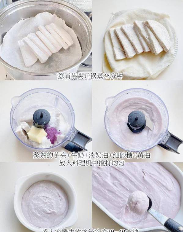 芋泥餡:荔浦芋頭130克,牛奶20克,淡奶油25克,細砂糖20克,黃油15克,紫薯粉少許。