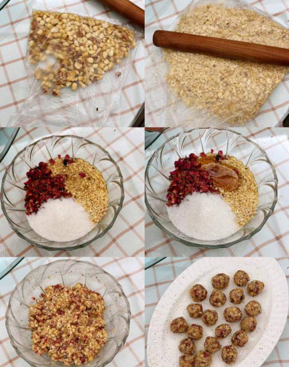 材料:花生100克,核桃50克,幹玫瑰花瓣,細砂糖50克,豬油50克,蜂蜜適量,糯米粉300克,澄面40克,蝶豆花粉適量,開水240克,玉米油適量。