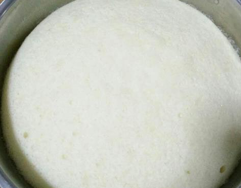 之後要做的是將一部分蛋白放入蛋黃汁中,攪拌均勻,然後將剩餘的蛋白也放進蛋黃裡面攪拌,一直攪拌均勻。接著要做的就是在面粉裡面倒入牛奶,然後放入攪拌好的蛋黃,將其調好做成蛋糕糊,蛋糕糊攪拌均勻之後要用力的在桌子上面嗑,將裡面的泡泡震出來。然後在蒸鍋裡面放適量的水,水燒開之後,將這些蛋糕糊放在蒸鍋上面蒸30分鐘!