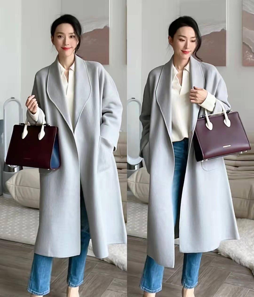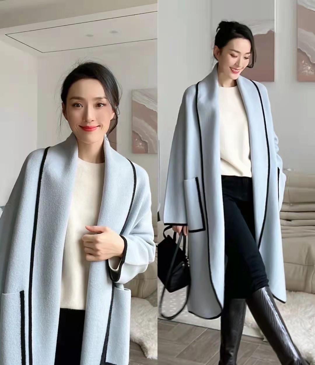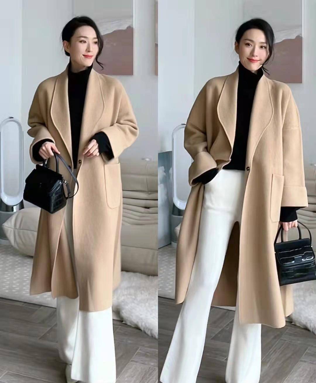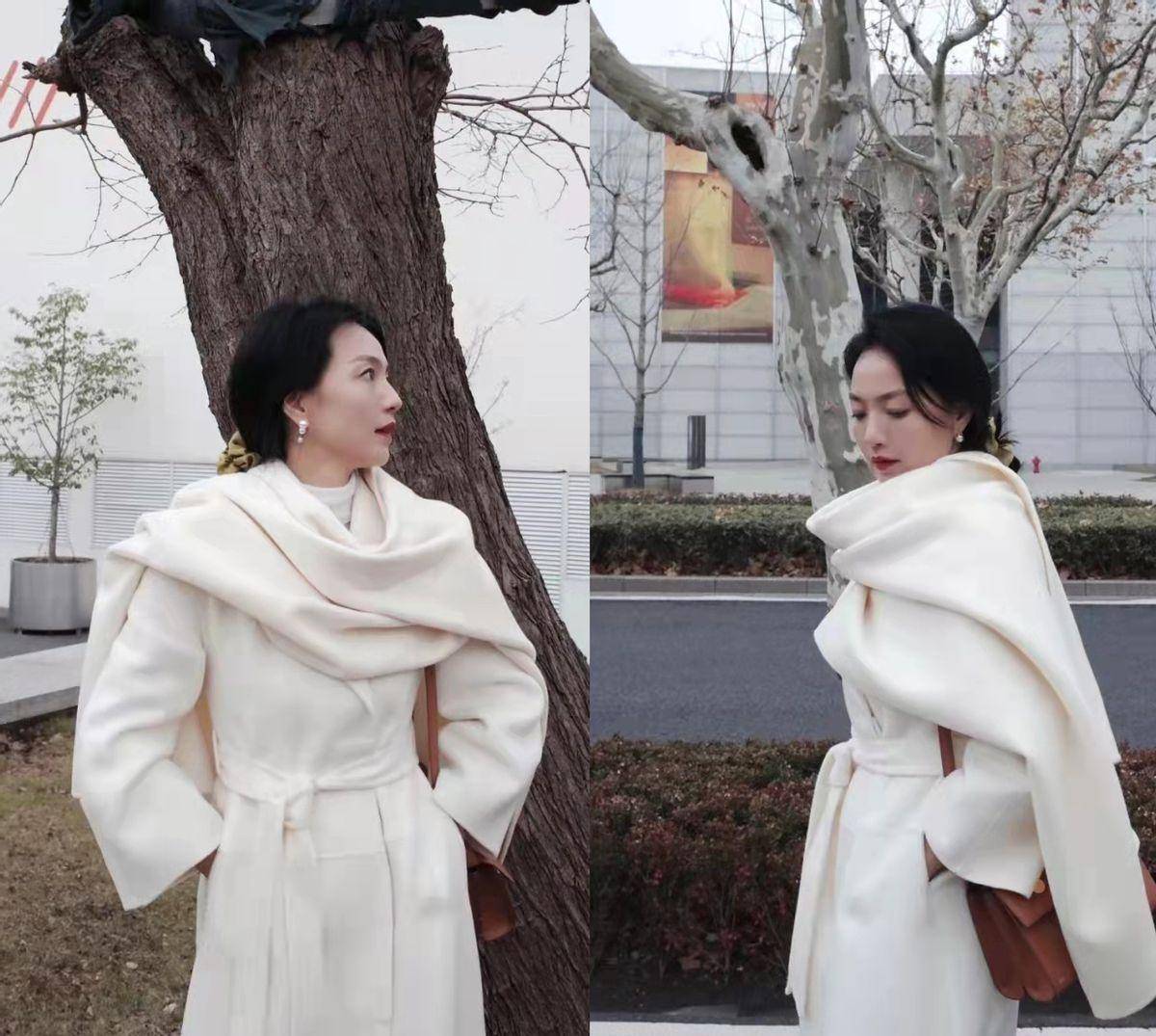隨著女性年齡的增長,可以嘗試更多淺色、低飽和度的顏色,利用其明度來營造減齡效果。比如這件白大褂就有一種優雅清新的感覺,很容易襯托出女性本人大方的魅力。搭配同色系的高領毛衣和披肩,上身色調統一,清爽又吸睛。