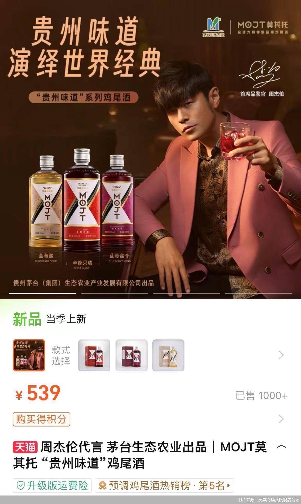 在莫其托酒類旗艦店內,莫其托“貴州味道”雞尾酒的宣傳海報在店鋪首頁張貼著。在此前首批產品斷貨後,12月21日北京商報記者發現,周傑倫代言茅臺生態農業出品的莫其托“貴州味道”雞尾酒已完成補貨,並已售超1000筆。值得註意的是,該產品目前已躋身於預調雞尾酒熱銷榜第五位。而在該榜單中,銳澳預調雞尾酒與每天烈刻相關產品位列前五。