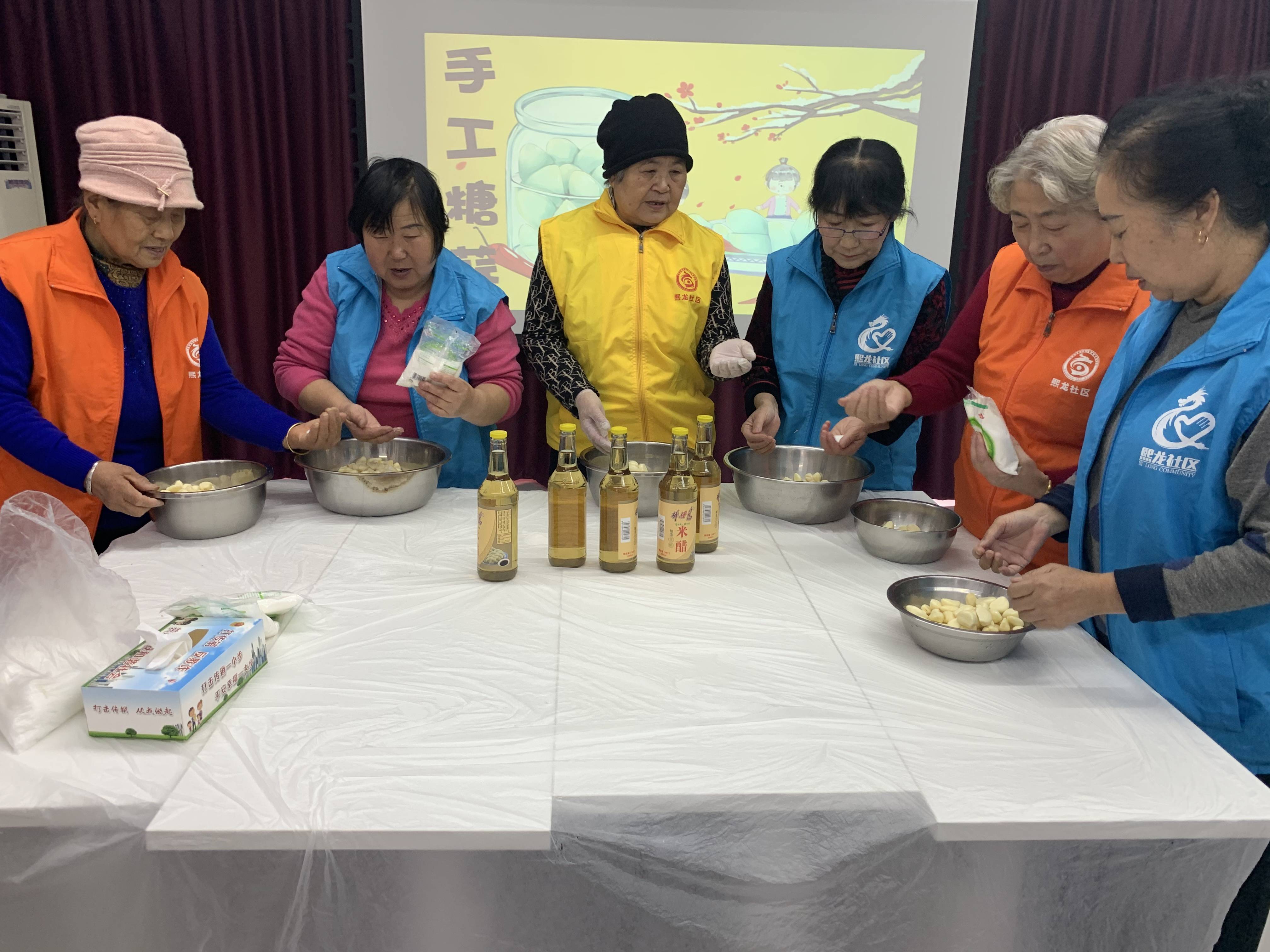 糖醋蒜是以大蒜以及適量的白糖、醋制成的小吃,醃制好後留著就稀飯吃、就著餃子吃,非常下飯。爽脆酸甜的糖醋蒜還有助於促進降血壓、降血脂、降低膽固醇,能夠預防心血管疾病。活動現場,社區人員將準備好的玻璃瓶、大蒜和米醋擺放在長桌兒上。居民們首先分組行動,有的在扒蒜、有的在燙洗玻璃罐、有的準備調料,帶前期工作準備好,大傢便開始按照比例制作糖醋蒜,一邊做一邊分享自己的醃制經驗。說話間,一瓶瓶蒜就裝好瞭,倒上米醋,蓋好密封的蓋子,糖醋蒜就醃制完成瞭。