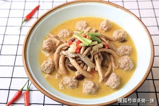 2、將豬肉末團成丸子放入蒸碗,再放入茶樹菇和適量清水,冷水上鍋蒸四十分鐘。