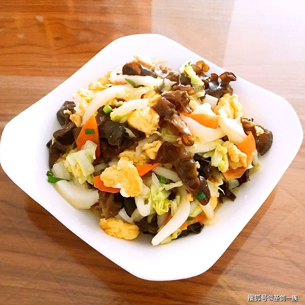 【材料】:大白菜1小棵,黑木耳10克,雞蛋1個,胡蘿卜1根,鹽適量,生抽1勺,料酒少許,油適量,水淀粉適量