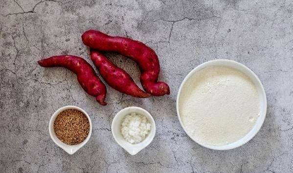 【配料】紅薯、白糖、油、糯米粉、芝麻