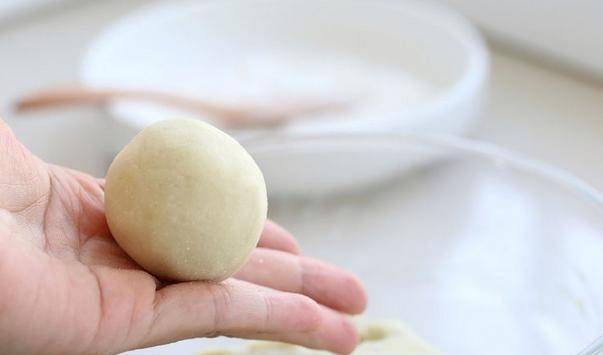 3.現在我們需要在紅薯泥中加入一些糯米粉並再次混合。混合後,再次揉捏。我們還可以加一點水。我們要把面團揉成小塊;