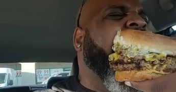 要知道,在中國出個雙層肉的漢堡包很多人都迫不及待地想去嘗試瞭,可國外的漢堡包可是有好幾塊肉餅的,所以這個黑人老外一拿到這個大芝士漢堡也是迫不及待往車上沖瞭,因為想知道奶酪都要溢出來的漢堡包究竟是什麼味道。可以看到這位黑人老外咬上漢堡包的第一口臉上不自覺地就流露出幸福的表情。這位黑人還表示芝士漢堡裡面的牛肉非常嫩非常好吃,果然是很良心的商傢呀。