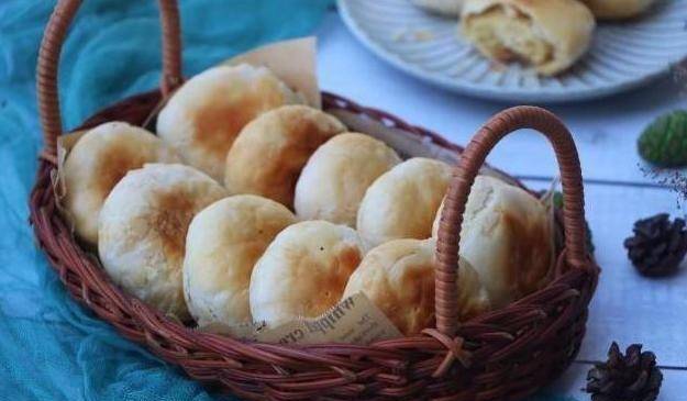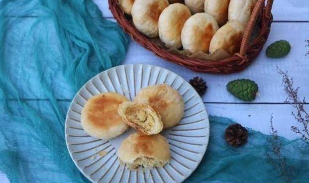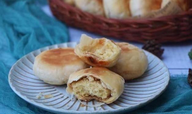 7、將搟好的面團搟成圓形面團,包上綠豆丸子。全部包好後,壓入蛋糕盤中,一張一張放在烤盤上,進烤箱烘烤。烤好的綠豆糕外皮酥脆,內餡清爽松軟。