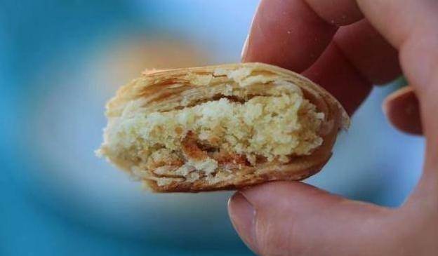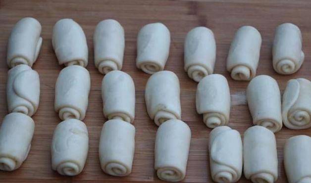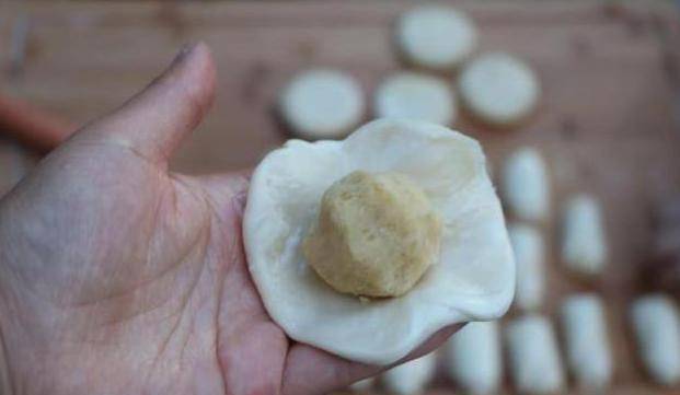 6、先將揉好的水油小面團放在手上壓緊,然後加入小酥皮面團,將小酥皮面團完全包裹起來。用這個方法把剩下的小面團包起來。然後用搟面杖將包好的面團搟成長條,然後如圖所示從左向右卷起來。