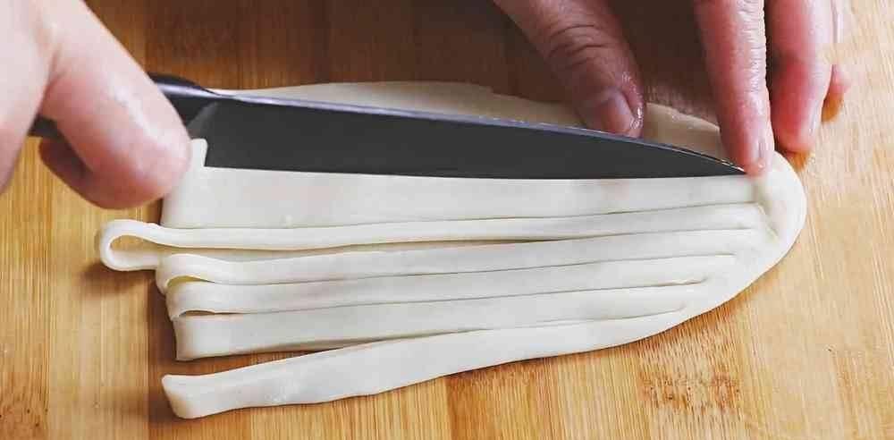 2、半小時後,我們直接用搟面杖將面團搟成長薄,然後刷一層油防止粘連,將面團分成兩半,將面團切成長條。刀,但不要將其切成碎片然後將其拆開。用手將面條稍微拉長。