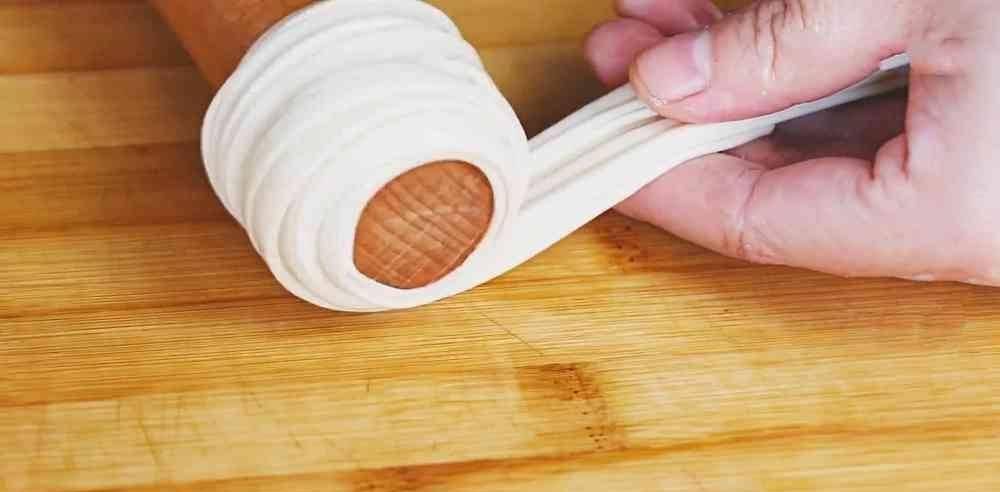 3、面條拉長後,用搟面杖搟成長條。卷好後,去掉底端。然後我們按照這個方法來制作剩下的面團。然後我們把準備好的面團放入蒸鍋裡。蒸10分鐘。