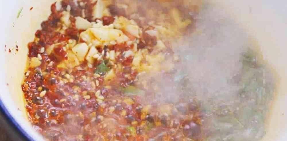 4.蒸面條的同時,我們做醬汁。取一個小碗,加入適量蒜末、蔥花、芝麻、辣椒粉。然後我們燒一些油。當油熱的時候,我們將熱油倒入其中。用筷子在碗裡攪拌至光滑,然後加入生抽、適量的鹽、少許雞精、適量的香醋,拌勻備用。你可以在傢裡根據自己的喜好定制這個醬汁!