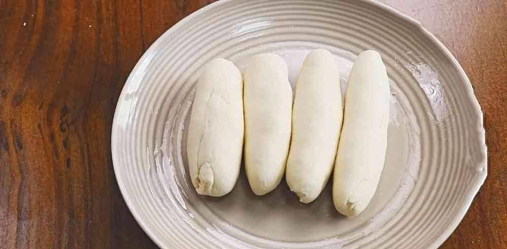 1、首先我們準備一個大水池。將500克面粉和一勺鹽放入碗中,然後與260毫升水混合形成面團。揉好面團後,我們把面團揉成長條,然後切成4等份。面部準備。然後將面團搟成長條,放在盤子上,刷上一層油,然後蓋上保鮮膜,松弛30分鐘。