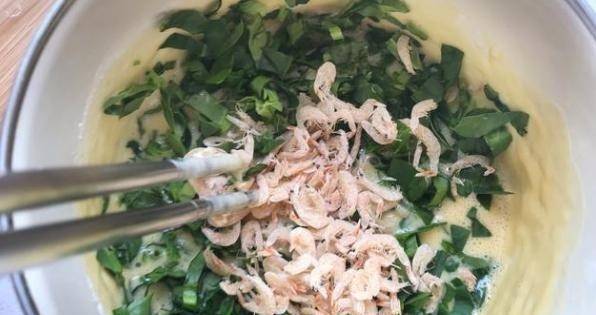 3.將浸泡過的蝦貝殼和切碎的菠菜豆放在碗中,用勺子攪拌,直到在混合物上隻能看到菠菜的顏色。