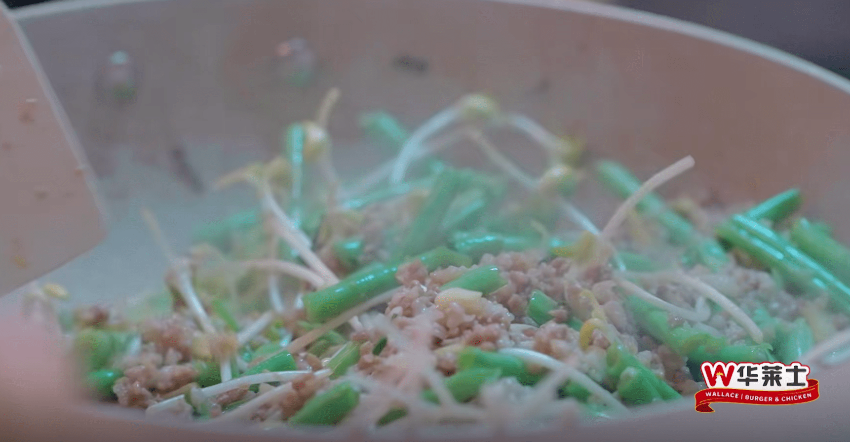 第四步加入豆角和四季豆翻炒。