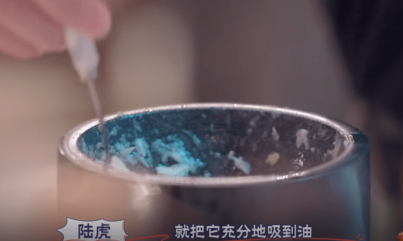 虎子牌燜面第一步蒜泥搗好後,把香油加熱到微微冒煙倒入蒜泥拌勻。這是此燜面的第一靈魂。