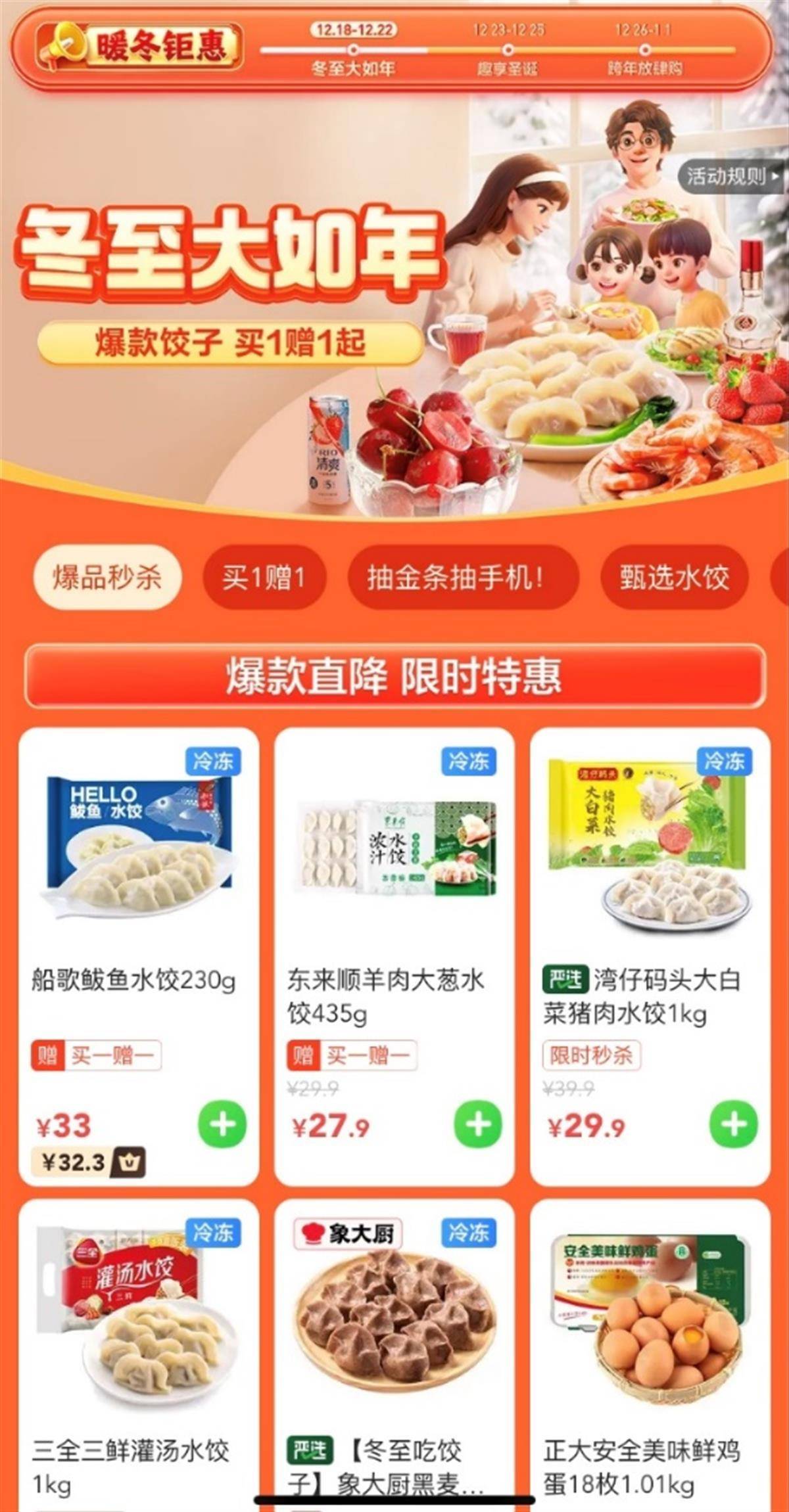 12月22日,隨著冬至到來,餃子、湯圓等節令美食進入“熱銷模式”。進入數九天的寒冷時節,北方地區愛吃餃子,南方人喜歡吃湯圓,年輕人更愛吃火鍋。今年,除瞭線下相關食材銷售紅火,不少消費者選擇通過即時零售平臺,把餃子、湯圓、火鍋、蔬菜等冬至食材一站式購齊,在傢吃一頓熱氣騰騰的冬至傢宴。