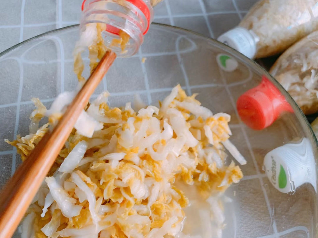 3、一小時後把醃制好的白菜絲裝入瓶子中,不要去用手捏,把水分弄出直接裝進去
