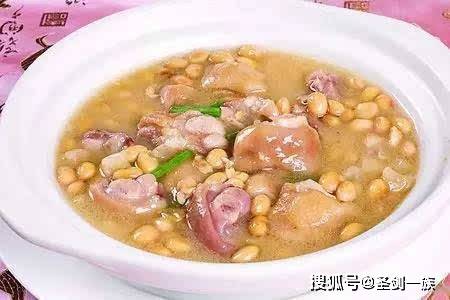 1、豬蹄清洗幹凈,冷水下鍋焯水,放入薑片和蔥段去腥,煮開後撇掉浮沫,再將豬蹄撈起來瀝幹水分備用。黃豆清洗幹凈,提前浸泡三個小時。