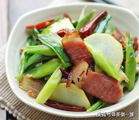 食材:蒜苗4根、臘肉1塊、紅綠辣椒各3根、薑一塊、蒜2粒、1勺生抽。