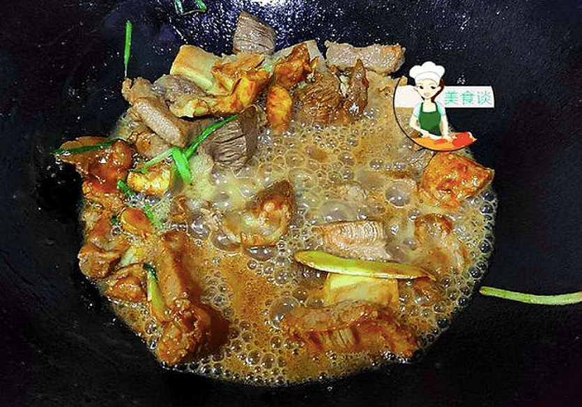 7、加入準備好的醬汁一起翻炒均勻,炒出醬香味來。加入適量的清水煮沸。然後轉移到砂鍋繼續煲煮35分鐘。