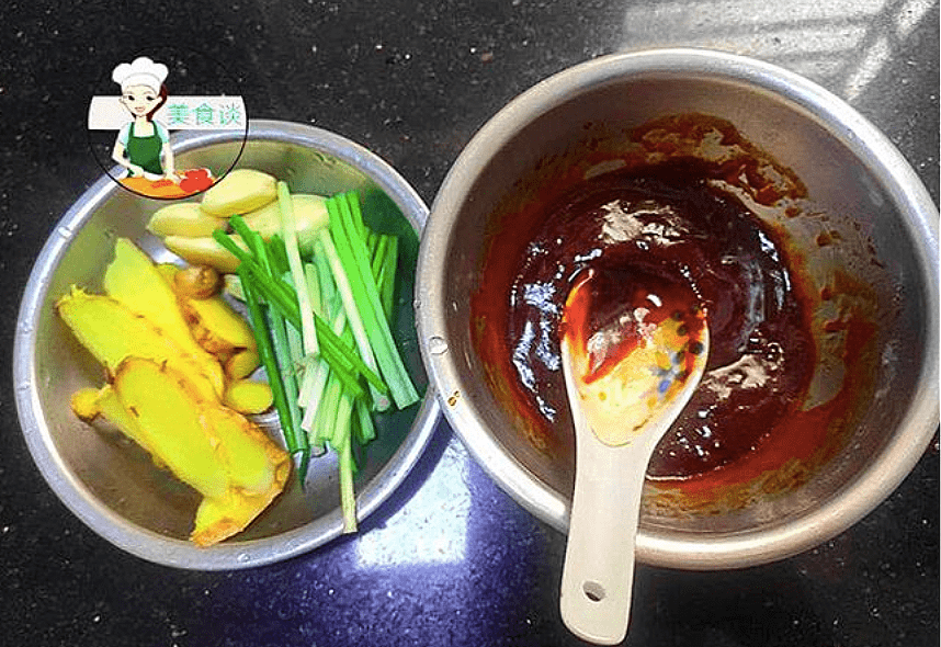 3、蔥薑蒜洗凈待用,準備醬汁:碗裡加入一勺沙茶醬、一勺海鮮醬、一勺生抽和一勺蠔油,攪拌均勻待用。