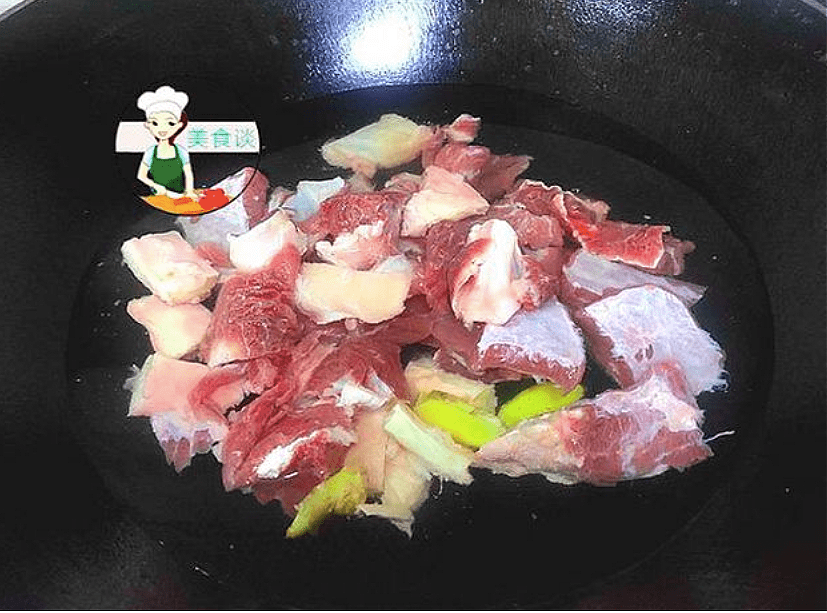 4、牛腩冷水下鍋,加入蔥薑和料酒一起焯水,撈起洗凈瀝幹水待用。