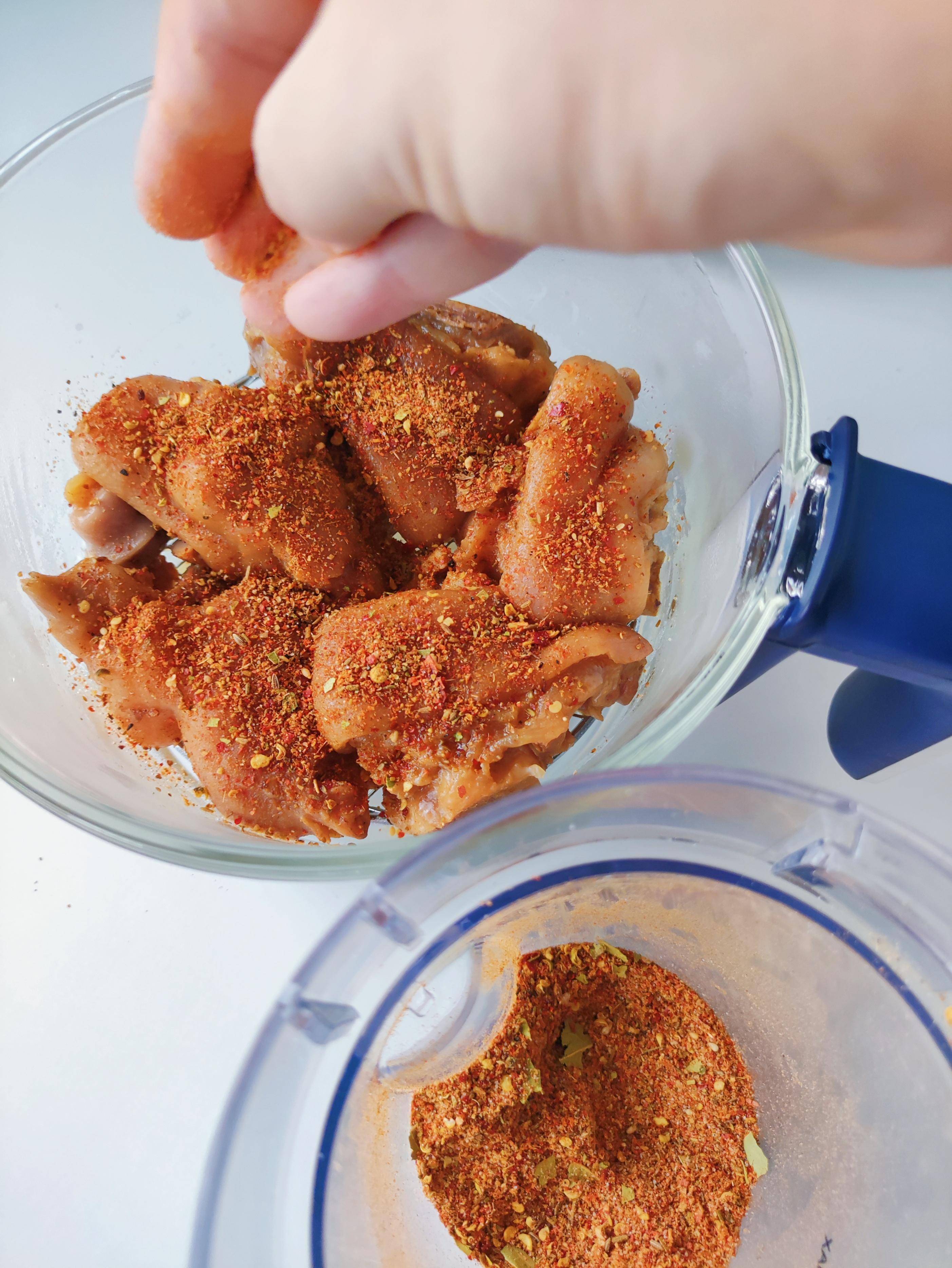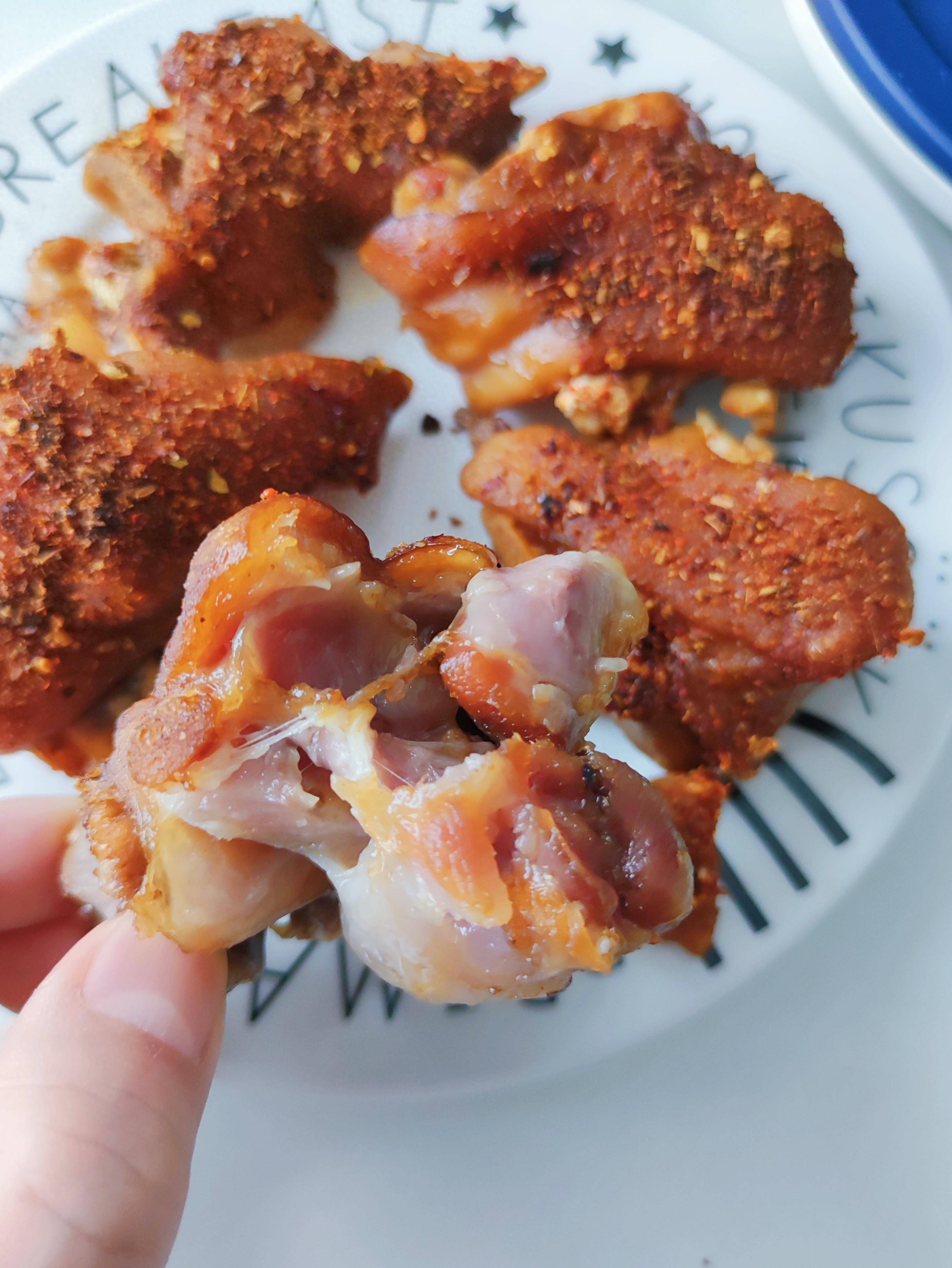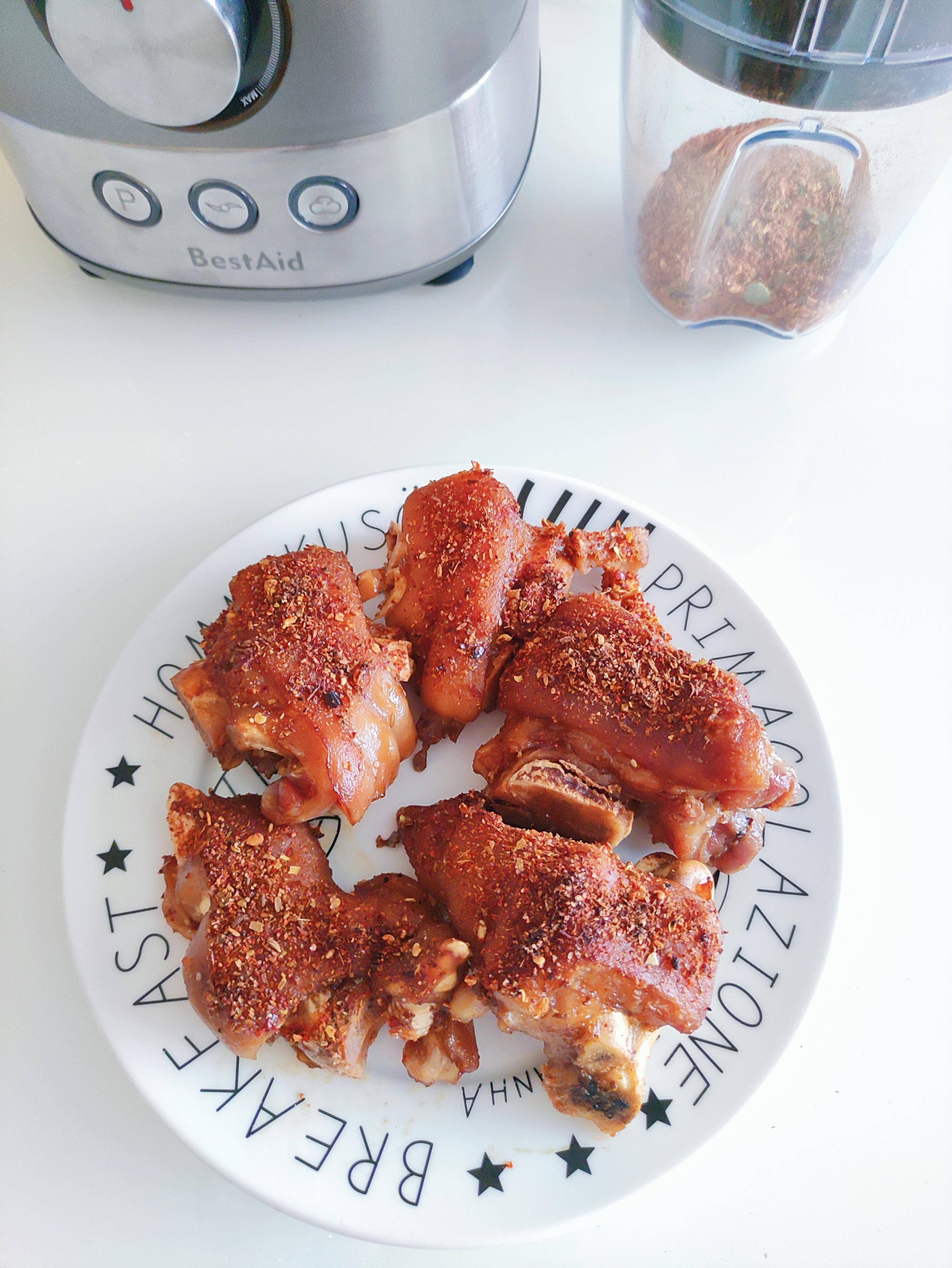 燉好的豬蹄撈出表面撒上自制的燒烤料,再次放入烤箱或者空氣炸鍋中,20度15分鐘至豬蹄表面微焦。