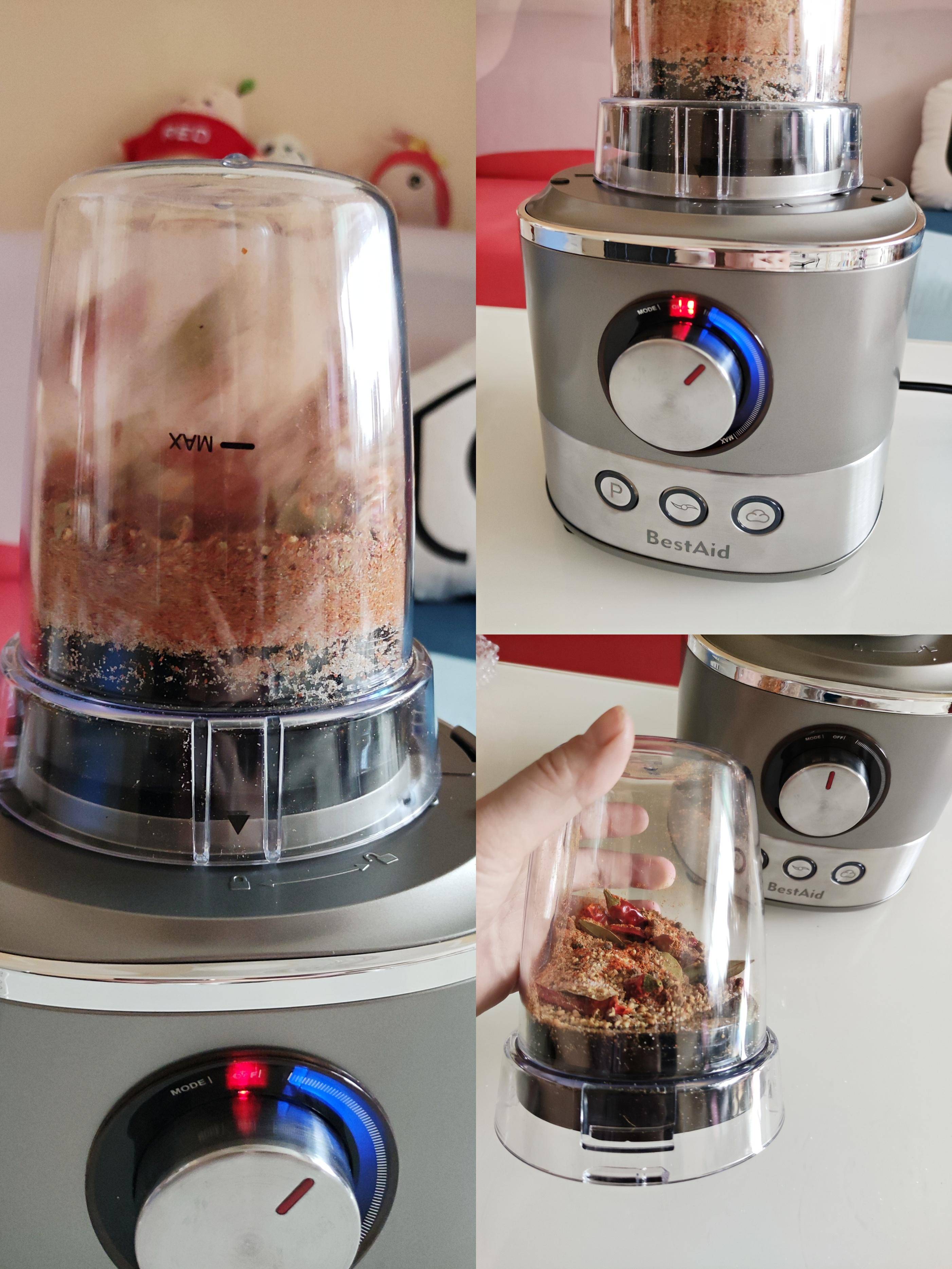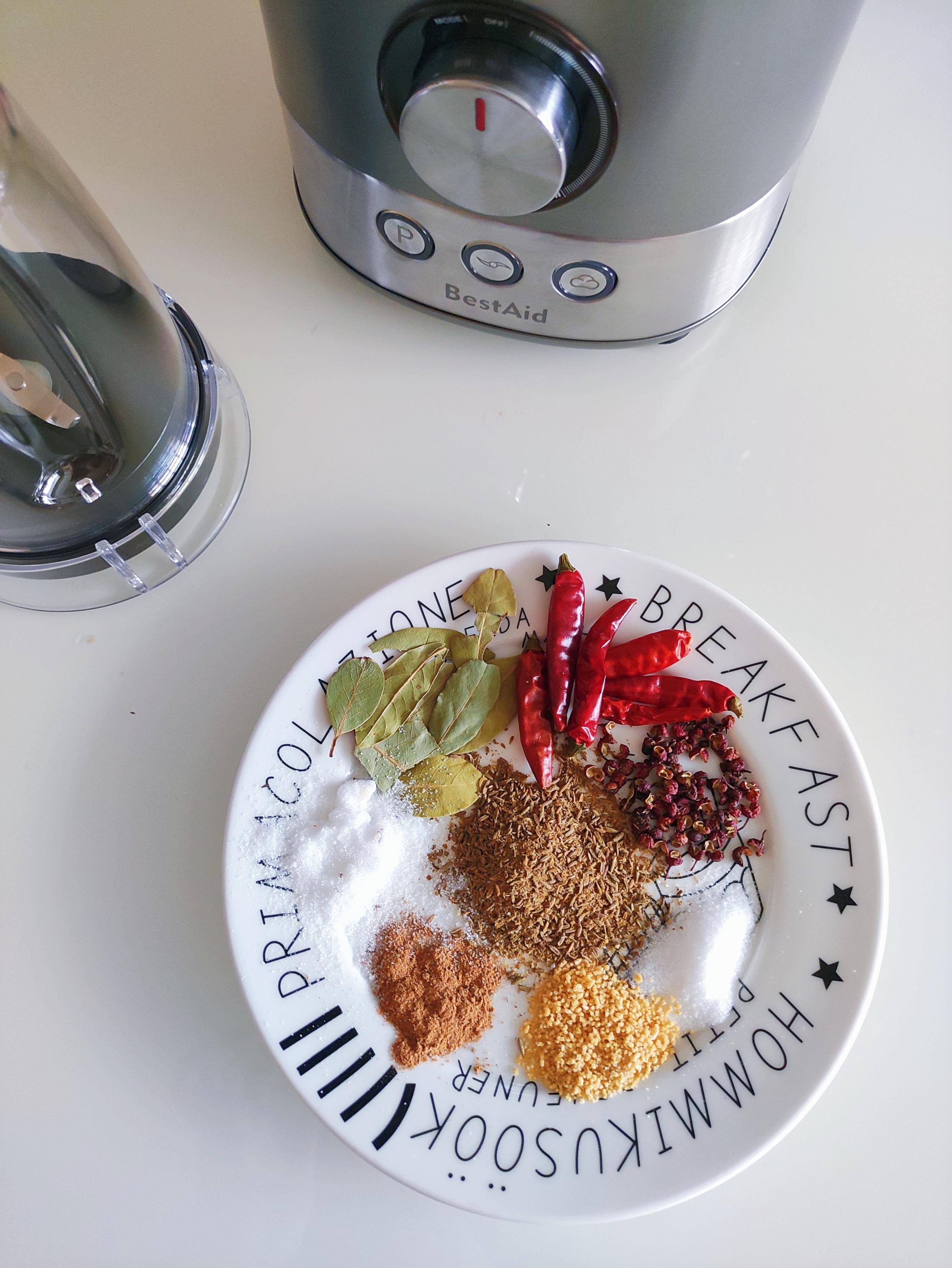 燉豬蹄的期間,用BestAid料理機做燒烤料,需要的一些配料有熟芝麻、熟花生、孜然粒、幹辣椒、五香粉、花椒粒、砂糖、雞精,一起放入研磨杯研磨成末。