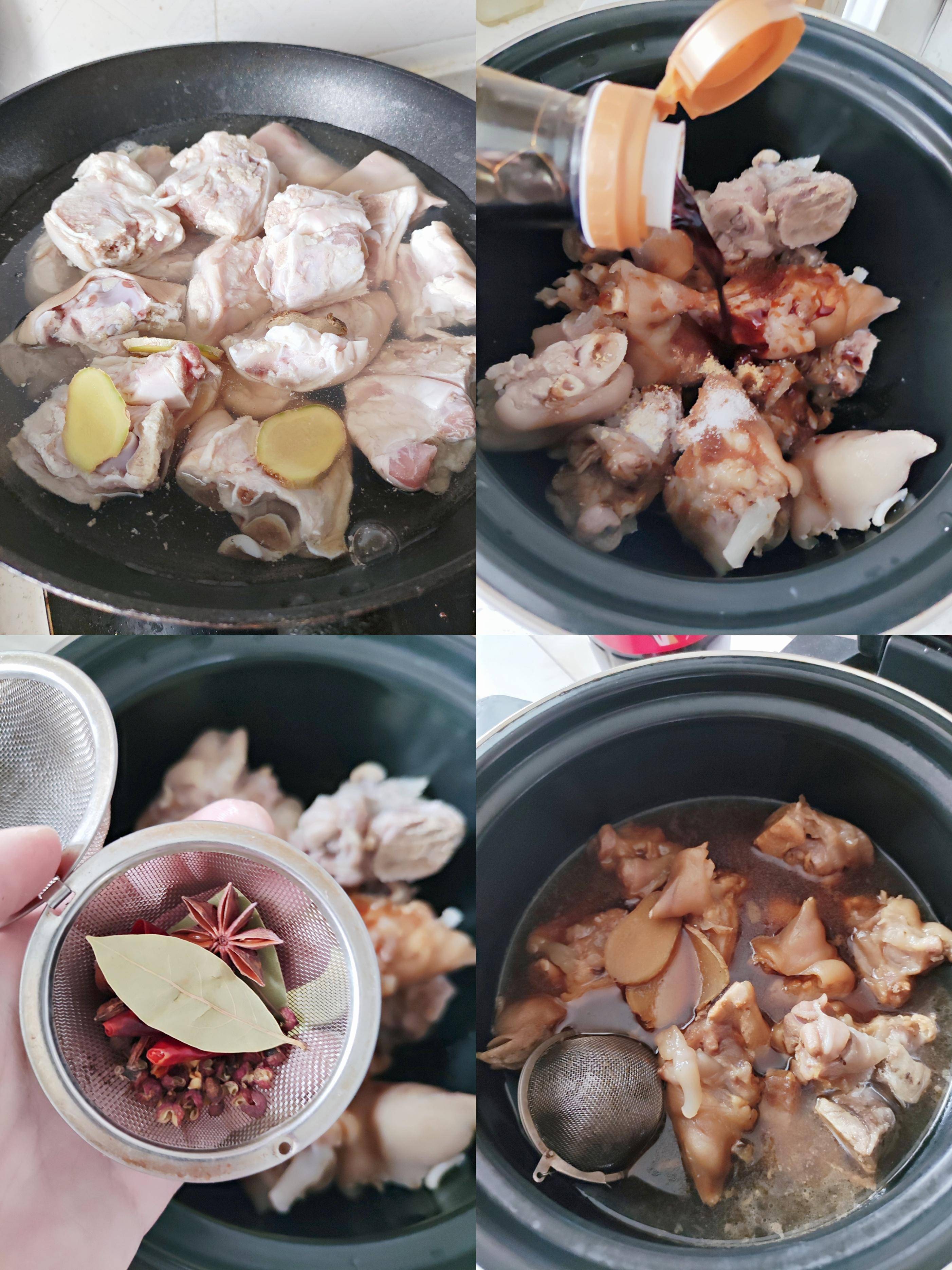 撈出後放入電壓力鍋,加入生抽、老抽、蠔油、鹽、冰糖、大蒜、桂皮、八角、香葉,用電壓力鍋燉半個小時。