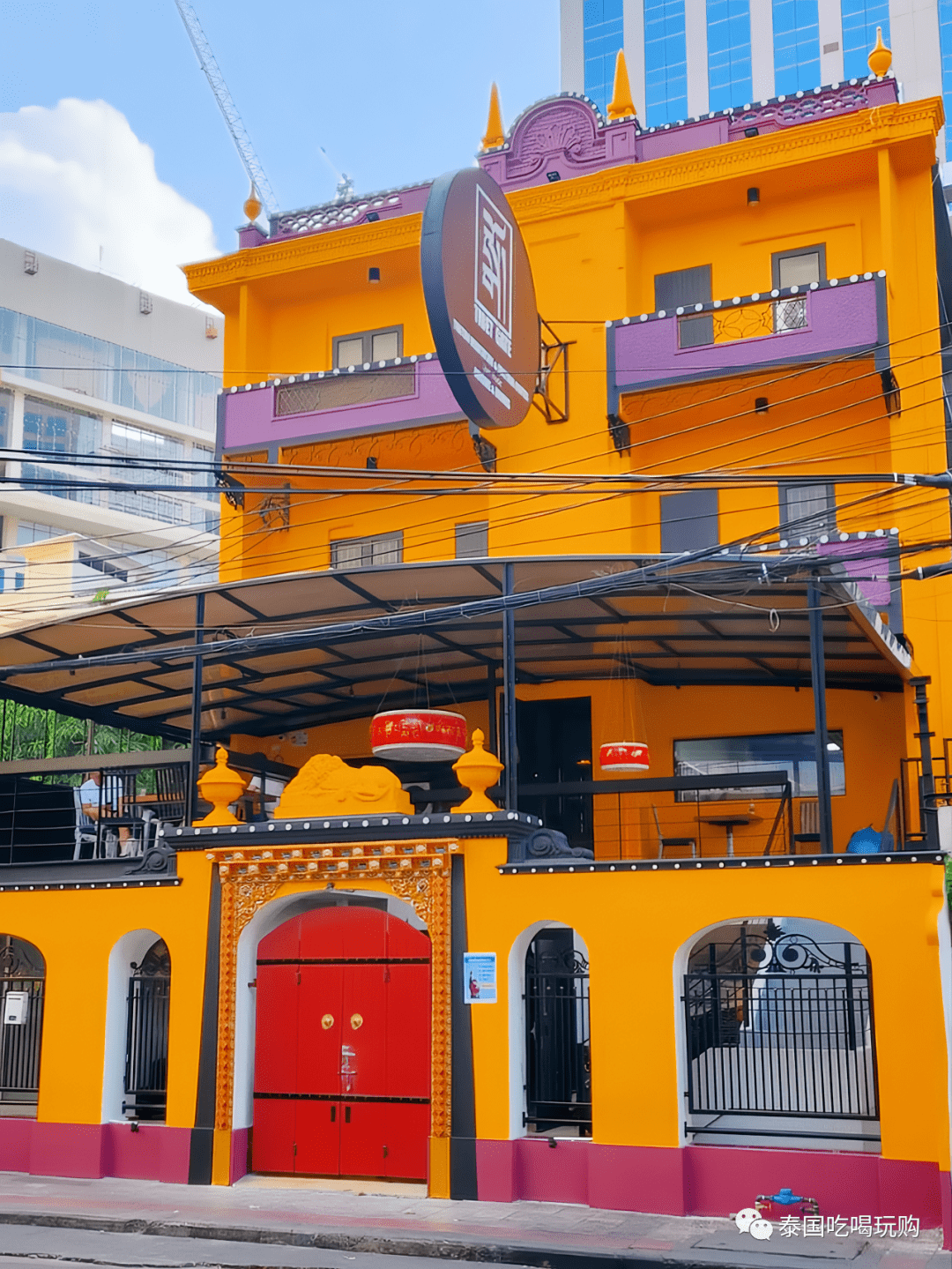 這傢餐廳開在素坤逸路,是居民樓改裝而成的一個小獨棟,裝修以藏族特色的鮮黃色調為主,在附近顯得尤為耀眼。門口有四個拱形窗戶和一個拱形大門,窗戶上面掛著幾個圓柱形的藏式黃鐘,是不是一秒錯覺到瞭西藏?